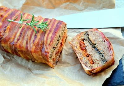 Застелите форму для запекания пергаментной бумагой, выложите пластинки бекона так, чтобы все дно было застелено, а концы свисали. Фарш разделите на три части. Уложите одну часть на дно, распределите и слегка утрамбуйте. Затем выложите слой из моцареллы и вяленых помидоров. Этот слой также слегка утрамбуйте.