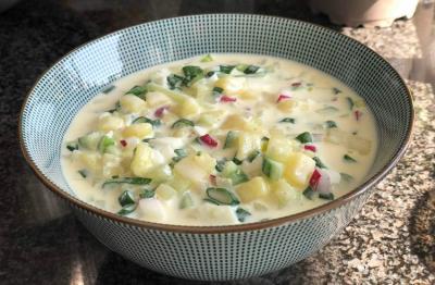 И картофелем. Можно добавить еще нарезанную кубиками вареную или запеченную куриную грудку.