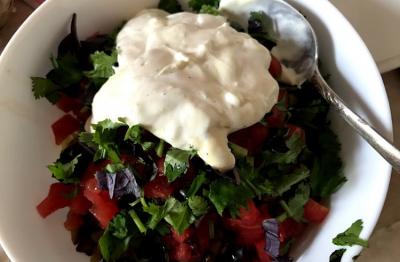 Смешайте сметану с измельченным чесноком, приправьте солью и перцем.