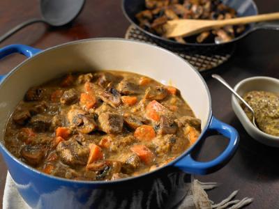 Ингредиенты: 100 гр. соленого сала; 1 большая нарезанная кубиками луковица; 4 ст.л. сливочного масла; 1 кг нарезанного кубиками мяса; 2 ст.л. муки; соль и свежемолотый перец по вкусу; ½ ст. коньяка; 2 ст. мясного бульона; ½ ст. дижонской горчицы; 2 ст.л. обычной горчицы; 3-4 нарезанные моркови, ½ кг очищенных и нарезанных на четвертинки грибов; ¼ ст. красного вина.
