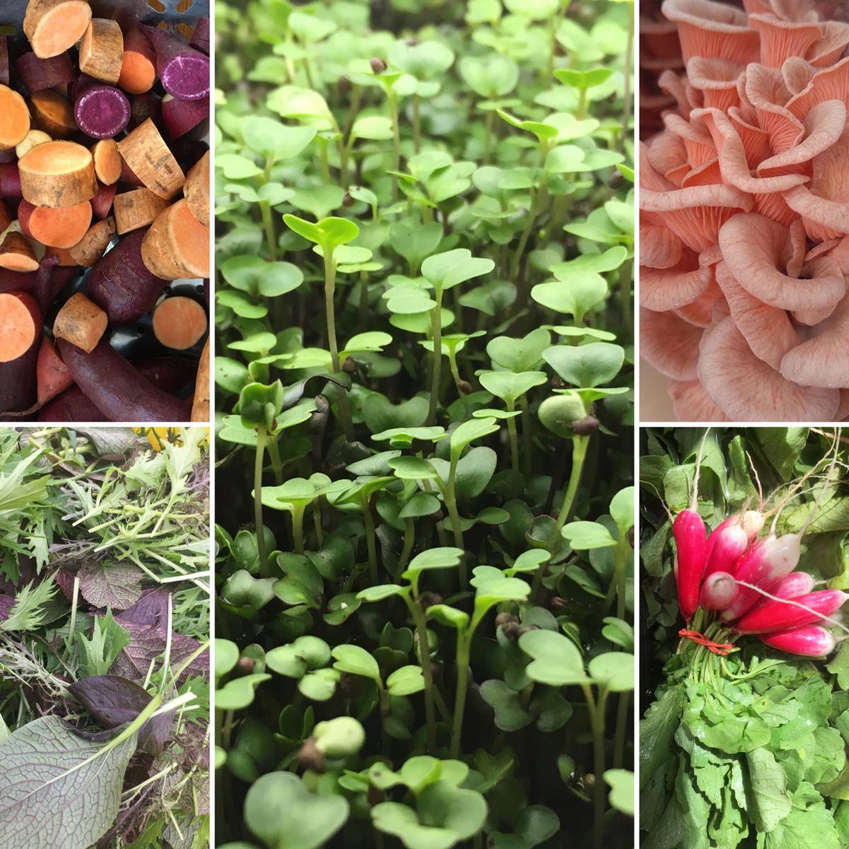A selection of local food, including a microgreens, mushrooms, seasonal vegetables, and value added products.