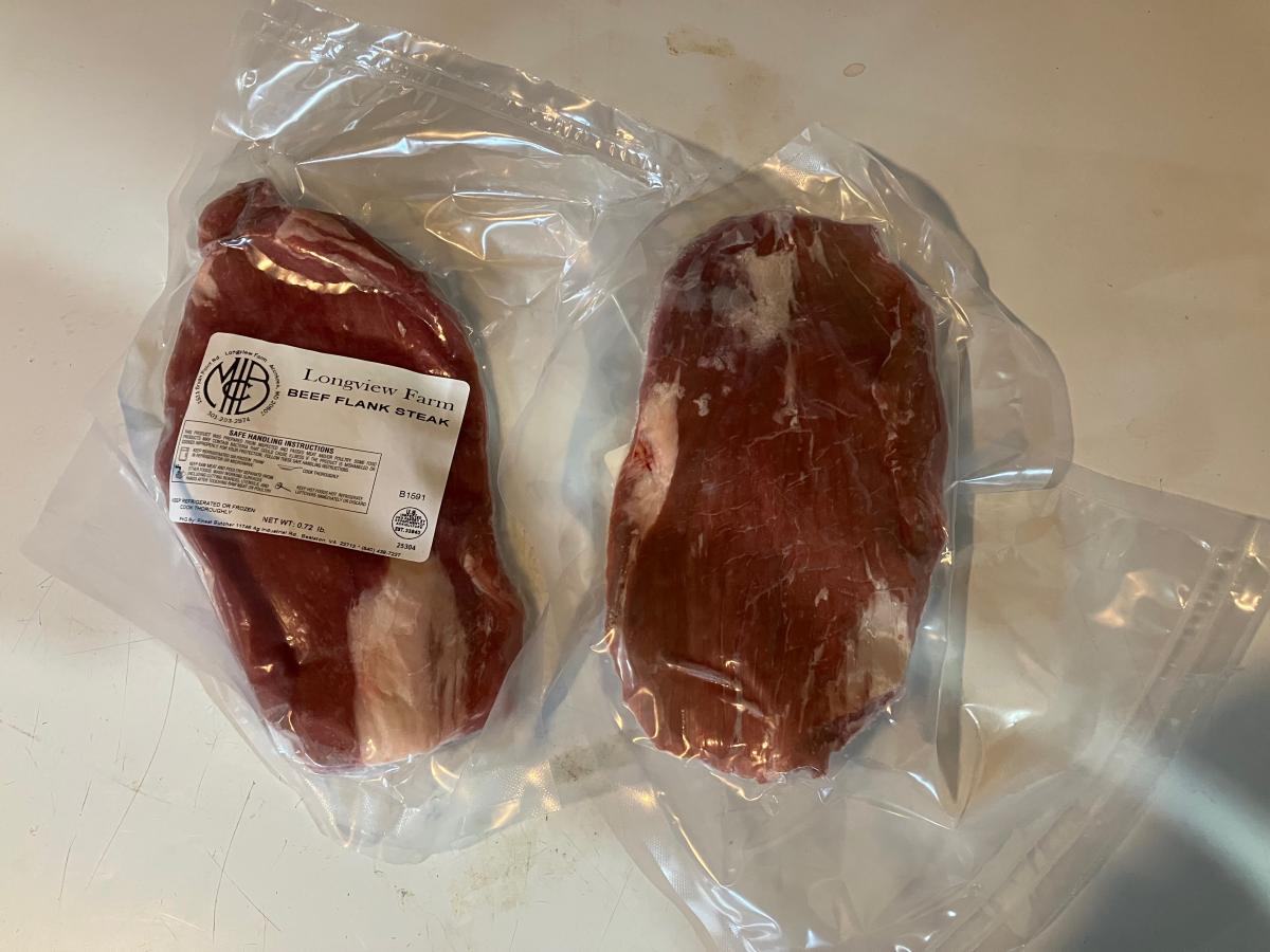 Flank Steak grass fed for life Angus beef, born and bred at Longview Farm, rotated daily to fresh pasture. Processed by USDA processor, frozen cuts are in vacuum sealed packages.