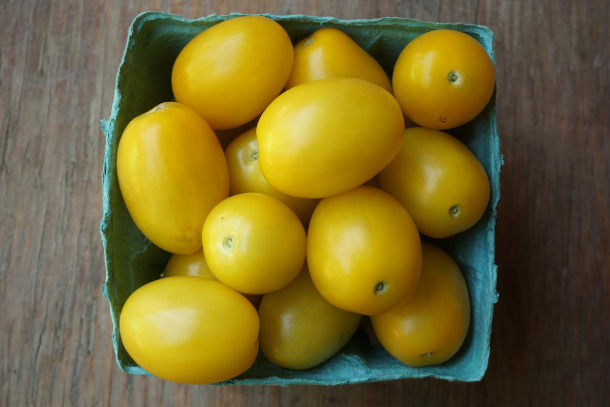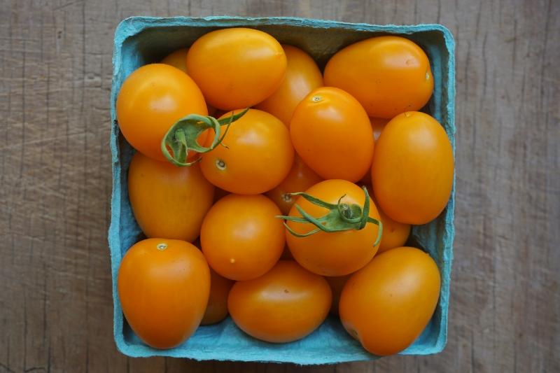 This tomato, named Justnya, is a delicious, bright cross between sunsugar cherry tomatoes and a plum tomato. Excellent multi-purpose tomato, and particularly suited for roasting.