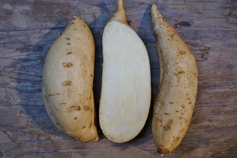 A white-skinned, white-fleshed sweet potato with starchy, Irish Potato-like texture, but the intense sweetness of your more common orange sweet potato.