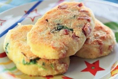 Ингредиенты: 500 гр сваренной в мундире картошки, 2 сырых и 6 сваренных вкрутую яйца, 75 гр натертого сыра, 70 гр нарезанной ветчины, 1 мелко нарезанная луковица, соль по вкусу, панировочные сухари (сколько пойдет), 1/2 пучка нарезанной петрушки, растительное масло для жарки.