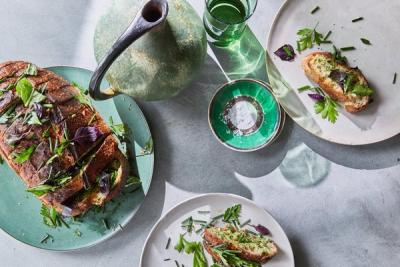 В миске смешайте петрушку и базилик, слегка полейте их оливковым маслом, посыпьте сверху на хлеб и подавайте.