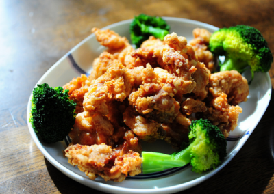 Ингредиенты: 450 гр куриных бедер без кости и кожи, нарезанных небольшими кусочками, 1 ст.л. натертого свежего имбиря, 1 измельченный зубчик чеснока, 2 ст.л. соевого соуса, 1 ст.л. саке, 2 ч.л. сахарного песка, 1/3 ст. картофельного крахмала, растительное масло для жарки, лимон для сервировки.