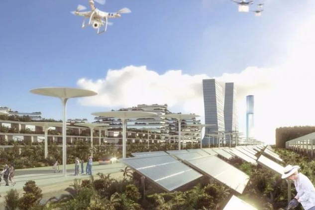 Благодаря немецкой инженерной фирме «Transsolar» вокруг города появится кольцо из солнечных панелей и сельскохозяйственных полей, орошаемых водными каналами. По задумке, вода будет собираться в огромном резервуаре у въезда в город, рядом с опреснительной башней.