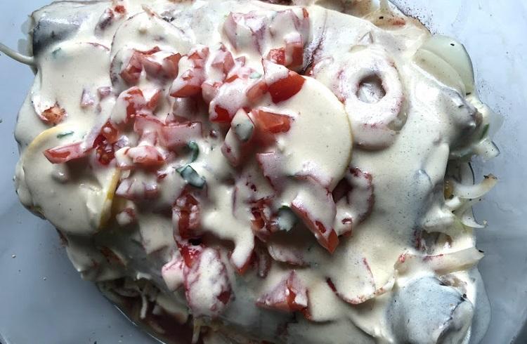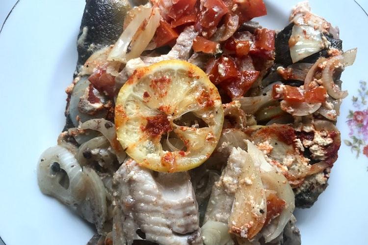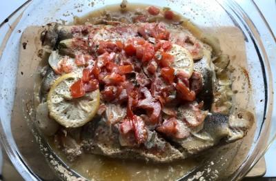 За это время рыба пропитается ароматом лука. За час до приготовления рыбу достаньте из холодильника, добавьте приправы, если желаете, нарезанный кубиками помидор и залейте соусом, приготовленным из сметаны и горчицы.
