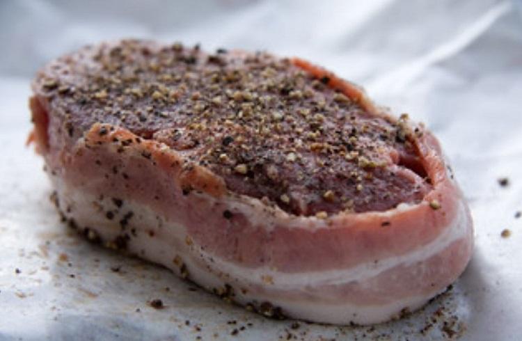 Из полученного фарша сформируйте небольшие котлетки или шарики, оберните их беконом. При необходимости бекон закрепите зубочисткой, отправьте в разогретую духовку на 45 минут.