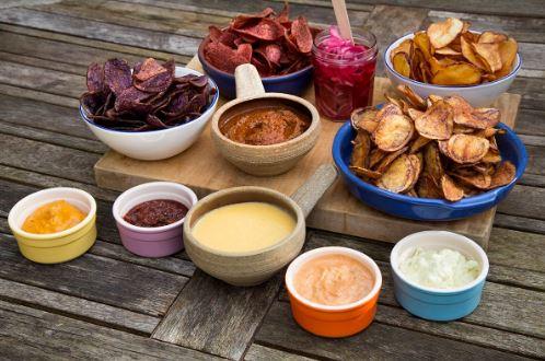 В качестве дополнения к чипсам, вы можете выбрать любой из шести соусов: катцу карри, дымчатое сырное фондю, баба гануш, мармелад из лемонграсса или свеклы.