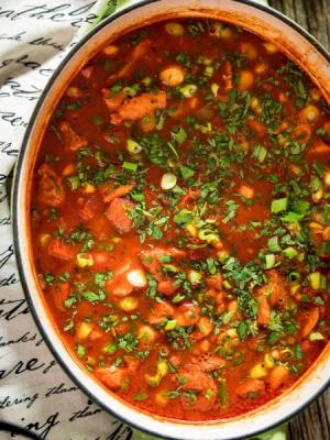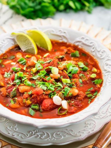Ингредиенты: 1 ст.л. оливкового масла, 0,5 кг. постной свинины, 200 гр. нарезанной копченой колбасы, 1 нарезанная кубиками луковица, 3 измельченных зубчика чеснока, 1 нарезанный перец халапеньо, 1 ст.л. копченой паприки, 1 ст.л. мягкого порошка чили, 1 ч.л. молотого тмина, ¼ ч.л. кайенского перца, соль и перец по вкусу, 700 гр. нарезанных кубиками помидоров (можно взять консервированные помидоры), 700 гр. белой или красной консервированной фасоли (можно их скомбинировать), 2 ст. говяжьего или куриного бульона (можно заменить водой), нарезанный зеленый лук, нарезанная зелень кинзы, долька лайма.