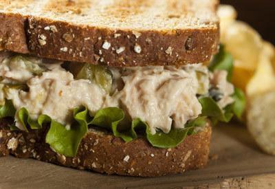 Ингредиенты: 2 банки консервированного тунца в собственном соку, ½ ст. домашнего майонеза, ½ ст. нарезанного кубиками стебля сельдерея, 3 ст.л. нарезанной кубиками красной луковицы, 3 ст.л. нарезанного кубиками красного перца, 2 ст.л. каперсов (без жидкости), 2 ч.л. лимонного сока, соль и перец по вкусу, листья салата или любая зелень, хлеб для бутербродов.