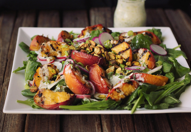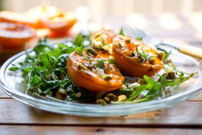 Ингредиенты: 2-3 пучка или 1 упаковка рукколы, ¼ ст. нарезанных и поджаренных фисташек, ½ пучка нарезанных листьев базилика, 1 ст. л красного винного уксуса, 1 ч.л. бальзамического уксуса, соль и перец по вкусу, 4 ст.л. оливкового масла, 60 гр. раскрошенного козьего сыра или сыра «Фета», 8 маленьких или 6 крупных абрикосов.