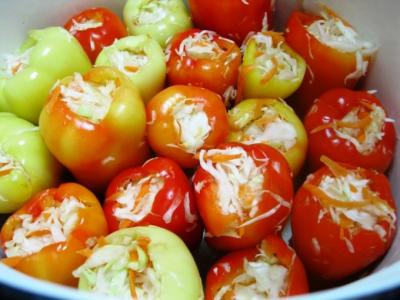 Ингредиенты: 3 кг. болгарского перца, 1 нашинкованный кочан капусты, 2 натертые моркови, 1 головка мелко нарезанного чеснока.