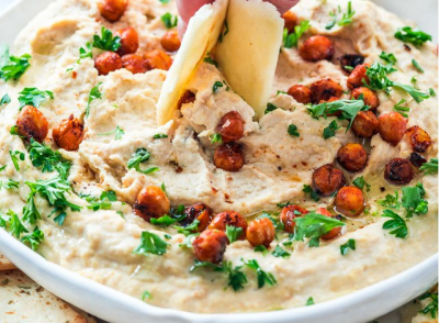 Готовый хумус выложите в блюдо, полейте оливковым маслом, слегка присыпьте паприкой, петрушкой и жареным нутом. Подавайте с лепешками Наан.