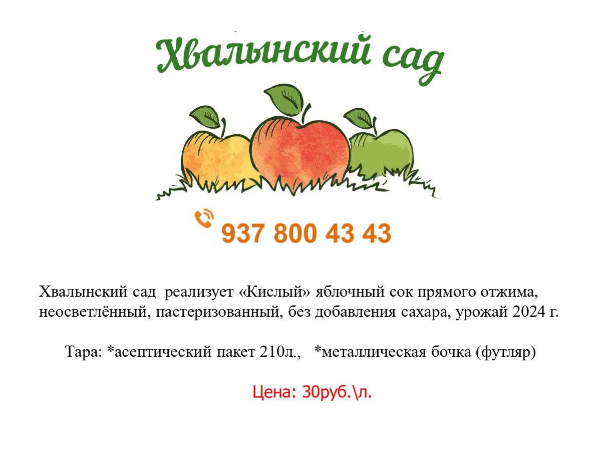 Хвалынский сад реализует «Кислый» яблочный сок прямого отжима, неосветлённый, пастеризованный, без добавления сахара, урожай 2024 г.